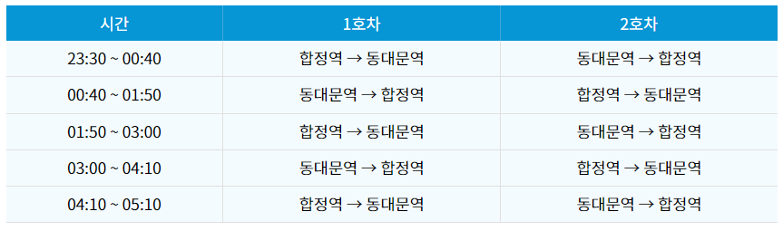 * 운행시간 : 평일(월~금) 23:30 ~05:10(토, 일 운행하지 않음)
