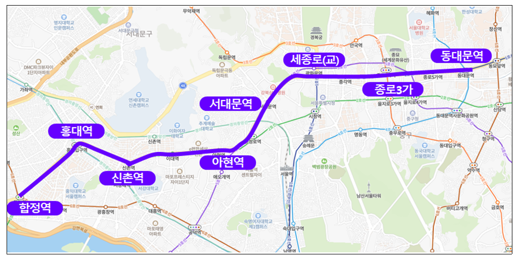합정역~홍대입구역~신촌역~아현역~서대문역~세종로(교)~종로 1가~종로 5가~동대문역(흥인지문)